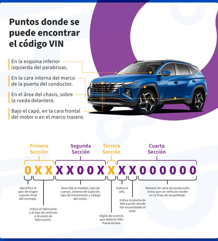 El VIN suele encontrarse en varios lugares, como en el salpicadero, en el vano del motor, en el marco de la puerta del conductor o en el título del vehículo.